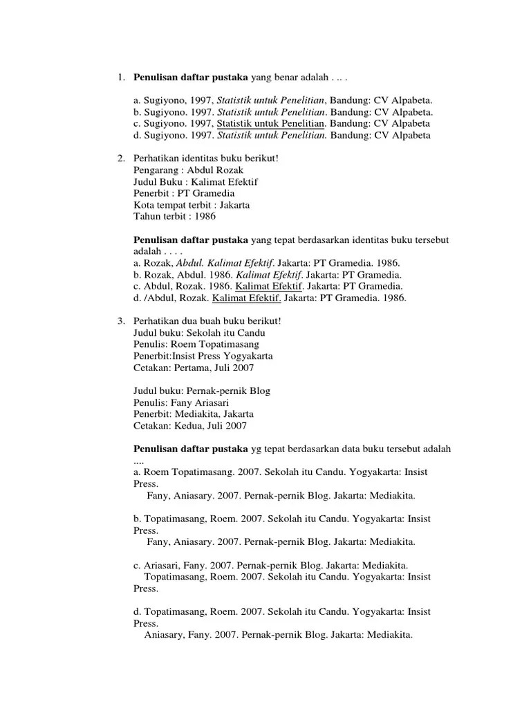 Penulisan Judul Buku Yang Tepat - Penulisan Daftar Pustaka Yang Benar Adalah Pdf : Dalam menulis judul, baik itu judul buku atau pun judul bab pada buku tersebut, dalam menulis judul, baik itu judul buku atau pun judul bab pada buku tersebut, .. Apakah anda mencari gambar tentang contoh penulisan judul buku yang benar? Judul buku, karangan, artikel, dan makalah serta nama majalah dan surat kabar ditulis dengan menggunakan huruf kapital pada huruf pertama setiap . Namun, untuk penulisan huruf kapitalnya sudahlah tepat, work from home harus ditulis huruf kapital semua karena merupakan kepanjangan kata dari . Judul buku setiap awal kata menggunakan huruf kapital, kecuali kata tugas. Judul menurut kamus besar bahasa indonesia diartikan sebagai kepala karangan yang terdapat pada cerita, drama, artikel, buku, ataupun tulisan .